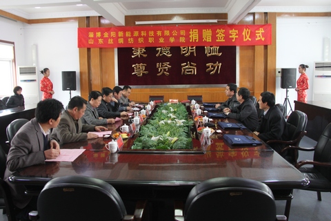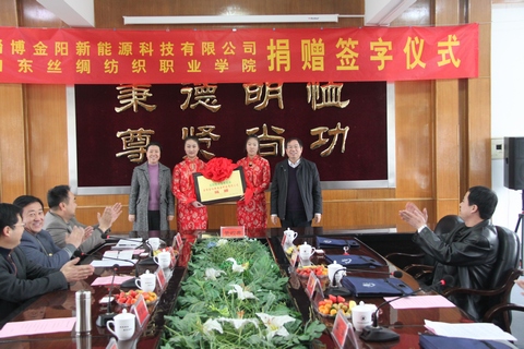 学院院长孙志斌对各位领导的到来和对学院的支持表示热烈的欢迎和衷心的感谢,他讲到,学院始终坚持“教育强校,科教兴校”的发展战略,不断加大教育投入,进一步改善办学条件,教育工作和办学水平都得到了长足的发展。淄博金阳新能源科技有限公司为了支持学院发展,向学院捐赠了智能太阳能淋浴系统,给我院师生带来了实实在在的温暖,这不仅是对山东丝绸纺织职业学院的拳拳关爱,更是对教育和社会各项事业发展的关心、支持和鼓舞。我院师生员工必将承关怀而奋起,化帮扶为力量,进一步解放思想,开拓进取,用脚印踏出坦途,用汗水升华果实,把我院的教育事业推向一个新的起点,让我们的学生成才、让家长放心、让社会满意!山东北斗星集团董事长张涛表示将一如既往支持学院的建设与发展,希望以后会有更多的合作机会,达到校企共赢。