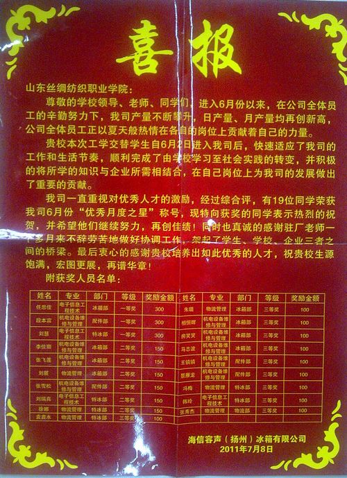近日,海信容声(扬州)冰箱有限公司给我院发来喜报。我院安排到该公司进行工学结合的160余名09级学生,因工作表现好,得到了公司上下的一致好评。其中,任思佳等19名同学荣获了该公司“优秀月度之星”荣誉称号及现金奖励。