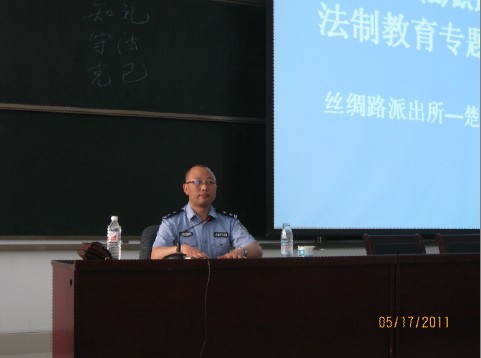 本次报告会由丝绸路派出所教导员楚云中主讲。楚教导员首先和大家一起回顾了最近几年来发生在全国高校大学生身上的违法犯罪典型案例,从一个个触目惊心的犯罪事实中暴露出在极少部分大学生身上仍然存在对生命的漠视以及对法律的无知,让人感到震惊的同时也给人以警醒。楚教导员从学法知法、懂法用法、遵法守法等三个方面,结合大学生违法犯罪典型案例,让学生掌握一些基本的法律法规知识,同时告诫大家,构建和谐校园,推动法治建设,离不开法律的广泛宣传和应用,需要每一位同学的热情关注和积极参与。弘扬法治精神,普及法律知识,树立法制观念,是每一个学生应有的责任和使命。