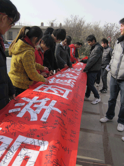 为了弘扬爱国主义精神,展现当代大学生的爱国热情,12月9日上午,由院学生会主办的纪念“12·9”签名活动在三号食堂前和教学楼前同时展开。活动以“高举团旗跟党走 我与祖国共奋进”为主题,以学生自愿在条幅上签名的形式,缅怀为国捐躯的烈士,时刻提醒着我 们大学生要牢记历史,勿忘国难,努力学习,发扬爱国主义精神和民族精神。(通讯员 李晓妍)