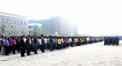 在庄严的国歌声中,鲜艳的五星红旗随风飘扬,伴随着国歌冉冉升起,全体师生向国旗行注目礼,庄严的国歌、飘扬的国旗,嘹亮的口号衬托出了今日祖国的强大和民族的繁荣。