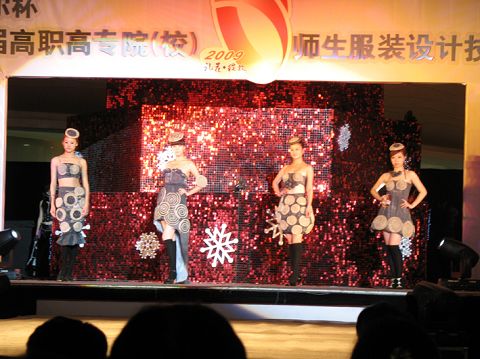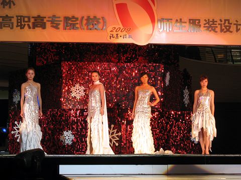 | 12月19日,2009全国第二届高职高专院(校)师生服装设计技能大赛决赛在扬州京华城举行。本次大赛由国家教育部高等学校高职高专服装纺织类专业教学指导委员会、中国高等职业技术教育研究会、扬州市人民政府主办,以“礼花•绽放”为主题,分为教师组和学生组。共有来自江苏、安徽、河北、山东、江西、湖北、广西、北京、重庆、新疆、内蒙古等10多个省市自治区的59所高职高专院校参赛。经评委专家评审,在收到的561件作品中,有35件学生作品、30件教师作品入围决赛。
