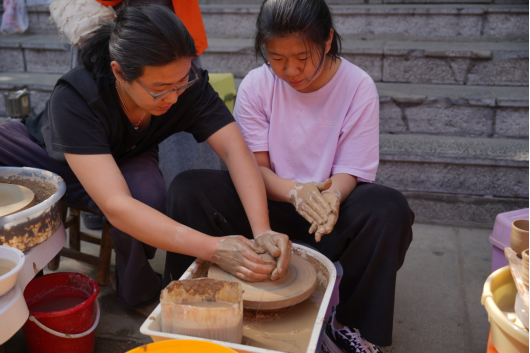 此外,许多小朋友也在现场体验了非遗技艺。他们对陶艺制作表现出了浓厚的兴趣。学校副教授、山东省陶瓷艺术大师、黑陶传承人曲冰老师亲自为游客们介绍了黑陶文化、制作过程和工具,并现场示范了工具的使用方法和陶制品的塑性过程。在志愿者的指导下,小朋友们手握红胶泥,充分发挥想象力,制作出了属于自己的黑陶作品。