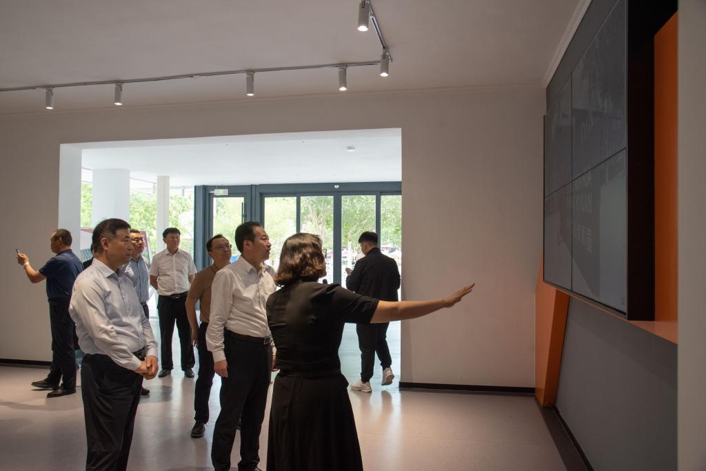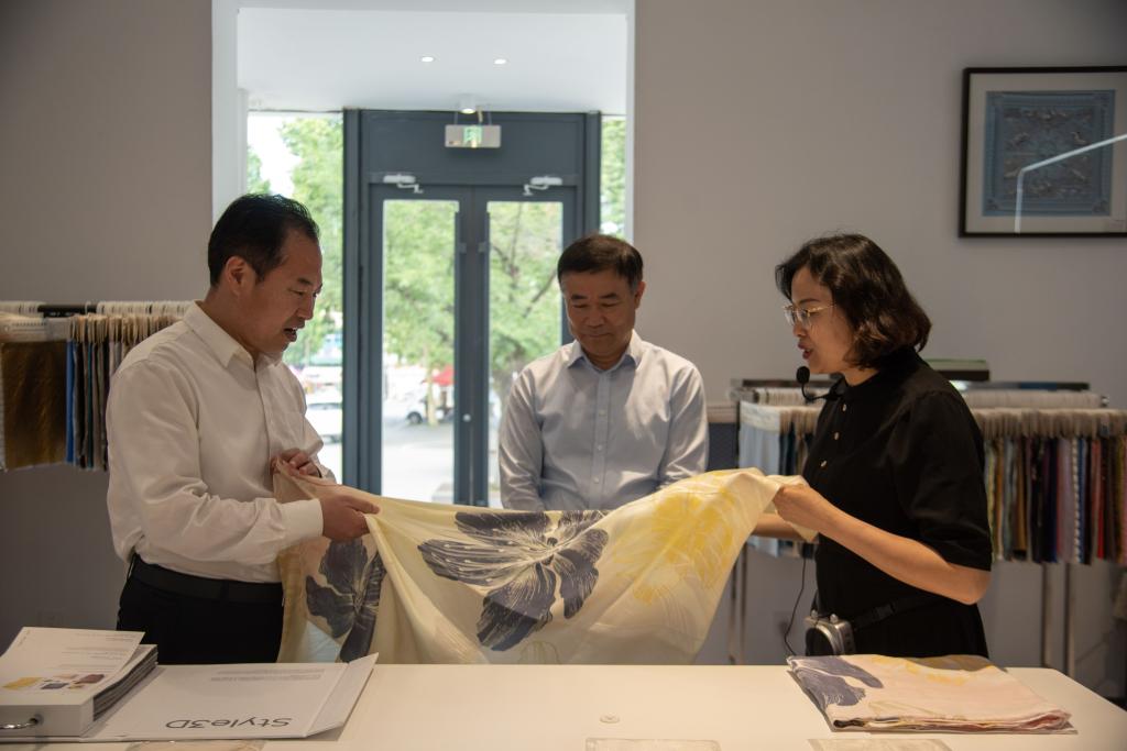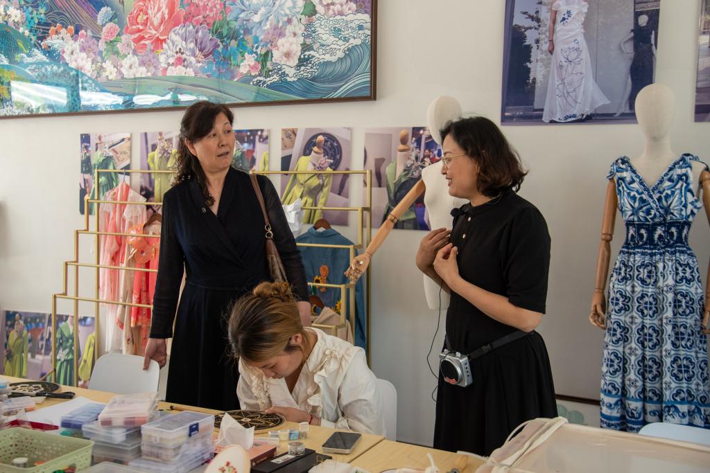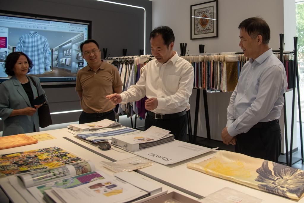 刘荩一一行到时尚创意中心参观了丝绸纺织服装全链路数字化实习实训中心。在服装面料数字中心,刘荩一详细了解以数字形式呈现的面料;在3D虚拟试衣中心,观看了从人体数据测量、二维纸样设计、3D服装建模、成品展示的整个过程;在VR虚拟服装店铺,沉浸式体验了通过虚拟现实技术创建的数字化购物环境;在服装陈列展厅,观摩了学生参加国家级比赛的作品以及各门课程的教学成果;在数字化色彩中心,参观了学校与上海元彩科技有限公司共同打造的校企合作基地。随后,刘荩一一行到大学生创新创业中心参观了青悠坊、丝之韵、素履坊,了解了学生创办的国潮文创产品、服装高级定制中的各项手工技艺,以及师生共同研发制作的手工皮具。