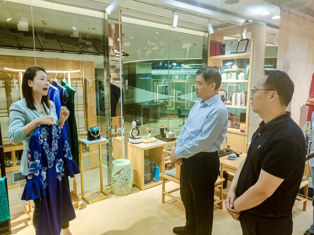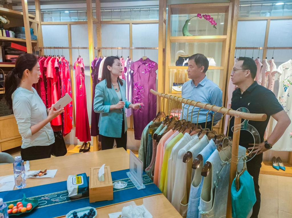 5月30日下午,范桂君一行来到凤栖梧青岛形象店,现场参观旗袍裙褂、新郎新娘服饰以及鲁绣、苏绣、粤绣等众多包含中国古典元素和社会文化底蕴的中式服饰,双方围绕如何开展中式服饰非遗研究、研发推广非遗文创进行了讨论。