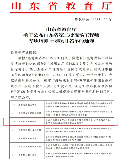 本站讯(通讯员 高利伟)近日,山东省教育厅公布《关于公布山东省第二批现场工程师专项培养计划项目名单的通知》(鲁教职函〔2024〕27号),确定68个项目为山东省第二批现场工程师专项培养计划项目,我校“山东轻工职业学院+山东信通电子股份有限公司+电子与信息大类+电子信息类+现场工程师联合培养项目” 确定为山东省第二批现场工程师专项培养计划项目。