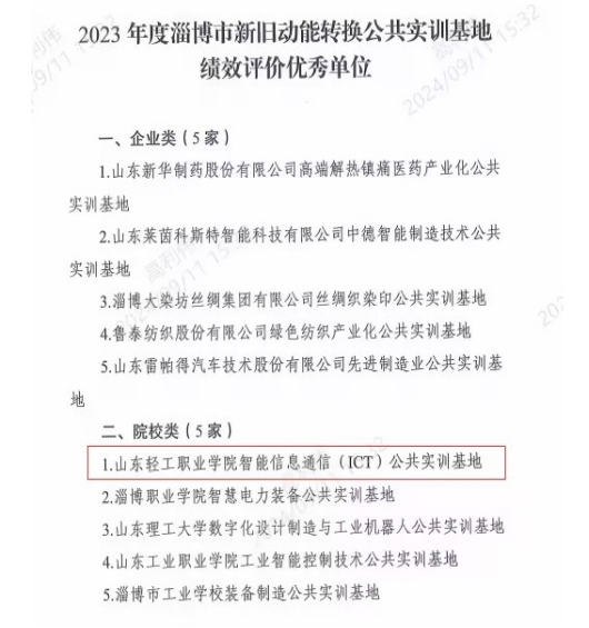 本站讯(通讯员 高利伟 李杰)近日,淄博市工业和信息化局发布了《关于公布2023年度淄博市新旧动能转换公共实训基地绩效评价优秀单位的通知》,我校智能信息通信(ICT)公共实训基地建设项目被确定为2023年度淄博市新旧动能转换公共实训基地绩效评价优秀单位。