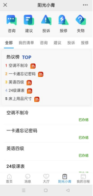 其实,学校线下的‘轻听’午餐会是在此前线上‘阳光小青’服务平台基础上的进一步拓展、优化与升级。自2021年3月起,学校就利用微信“腾讯微校”平台建立了一站式服务平台“阳光小青”,包括我投诉、我建议、我咨询、我报修、我招领五个模块,师生轻松动动手指就能反映问题。