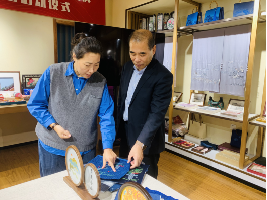 在北京丽鑫服饰文化有限公司,袁雷一行实地考察了“通州八景、百家姓、梅兰竹菊”等马尾绣、盘扣、苏绣、云锦文创产品。在与郭鑫董事长的交流中,袁雷一行不仅深入了解了这些宝贵非遗产品的历史渊源与技艺精髓,更捕捉到了非遗文创产品在现实环境中的蓬勃生命力。