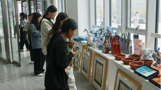 山东轻工非遗学院师生创作的传统纹样服饰系列、非遗草木染系列《与时光有染》《国风丝绸文创系列》作品、《玩偶系列》作品;黑陶镂空雕刻技艺的《莲年有余》、《水滴》系列作品;马尾绣系列作品;陶瓷《齐风系列》作品等十三个系列200余件作品在图文信息楼一楼展出,精美的非遗文创让参观者流连忘返。