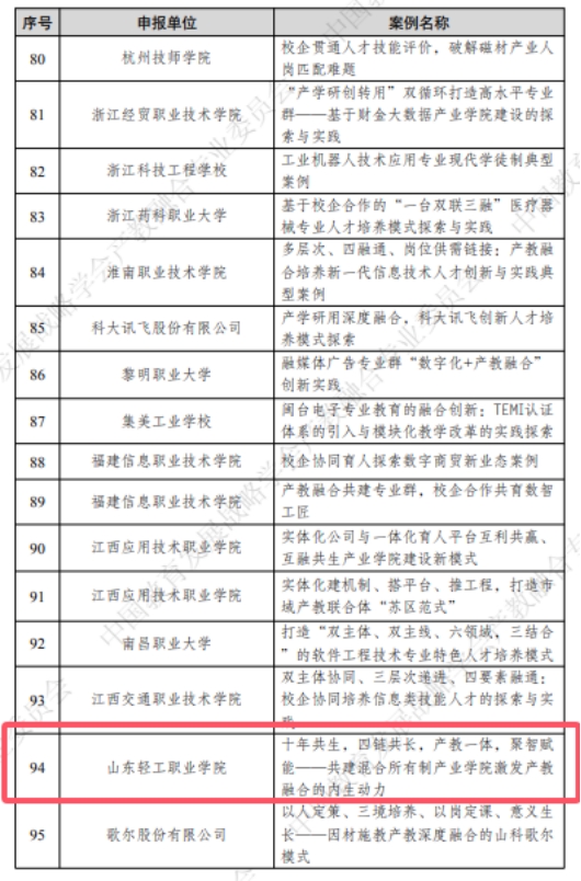 本站讯(通讯员 宋玉玲)近日,中国教育发展战略学会产教融合专业委员会发布《关于公布2023-2024产教融合校企合作典型案例名单的通知》,经资格审查、专家评议等程序,我校报送的《十年共生,四链共长,产教一体,聚智赋能——共建混合所有制产业学院激发产教融合的内生动力》成功入选2023-2024产教融合校企合作典型案例。