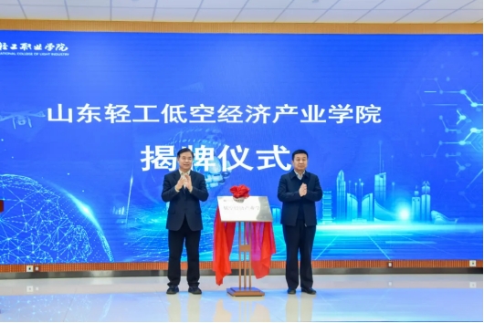 成立大会上,范桂君分别与淄博市教育局党组书记、局长孙英涛,淄博市交通运输局党组书记、局长杨刚,为淄博市低空经济产教联合体、山东轻工低空经济产业学院揭牌。