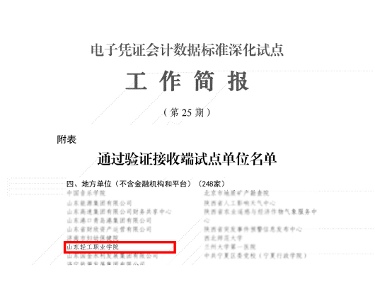 本站讯(通讯员 王浩)1月8日,财政部联合税务总局、人民银行、国务院国资委、国家档案局、国家标准委、国家电子文件管理部际联席会议办公室、中国民航局及中国国家铁路集团有限公司等8部门(单位),召开电子凭证会计数据标准试点总结会议。会上,对通过验证的接收端试点单位进行通报,我校作为山东省34家试点单位之一顺利通过验收。