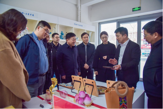 在1960大学生创新创业中心,沈培林一行参观了青悠坊、丝之韵、素履坊,了解了学生创办的国潮文创产品、服装高级定制中的各项手工技艺,以及师生共同研发制作的手工皮具。随后,沈培林一行来到1960丝绸文化创意园,参观了1960丝绸博物馆,详细了解了1960丝绸博物馆发展历史,观看了丝绸之路、蚕桑文化、齐地丝织物等文化遗产主题展品。