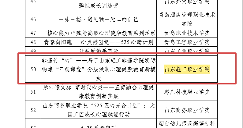 本站讯(通讯员 代文娟)近日,在2025年山东省高校心理健康教育月评选中,山东轻工职业学院申报的《非遗传“心”——基于山东轻工非遗学院实际构建“三类课堂”分层浸润心理健康教育新模式》项目,荣获心理健康教育特色活动类奖项。