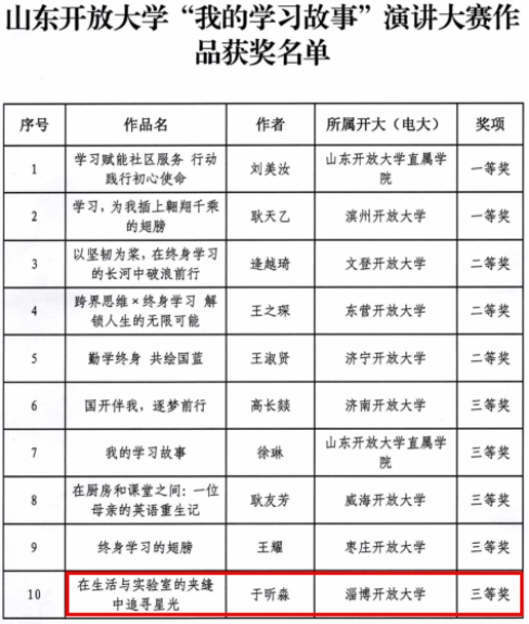 学校在山东开放大学“我的学习故事”演讲大赛中获奖