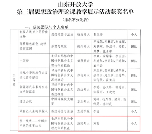 本站讯(通讯员 左西坡)近日,山东开放大学第三届思想政治理论课教学展示活动评选结果公布。淄博开放大学在本次活动中表现优异,荣获多个奖项。团队项目《商脉千年护文明——文化遗产活态保护的山东实践》《回首来路漫漫 矢志不改初心》《假如没有马克思——马克思主义的人民视角》《从“丝路之源”到国潮先锋》和个人项目《统一战线——中国共产党的重要法宝》均荣获三等奖。此外,淄博开放大学因组织工作突出,获评“优秀组织奖”。