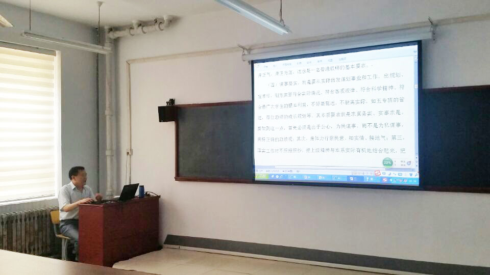 张院长首先对“三严三实”的具体内容进行讲解,明确“既严以修身、严以用权、严以律己,又谋事要实、创业要实、做人要实”的党的要求,提醒在座教师 “三严三实”只有24个字,却内涵丰富、精辟深刻,是我们做人做事、为人师表的警世箴言。然后张院长逐条分析讲解,结合我们自身工作中出现的如五专班的管理,每位教师的成长规划等实际问题提出要求。在课上,张院长肯定了本系党员教师呈现出爱生实干、作风深入的清新气象,但也指出系内“不严不实”的问题还不同程度存在,接着又对党员教师中存在着的“不严不实”问题分析原因,要求教师查缺补漏,对我们提出“加强学习,强化道德修养,坚持实事求是“这三个要求。