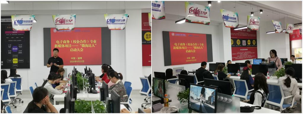 2020年9月22日星期二下午,商务贸易系电子商务(校企合作)专业举行新媒体项目——“微淘达人”启动大会,商务贸易系系副主任巩向玮、商务贸易系教务科副科长韩鑫玮、商务教研室主任庄明星和专业教师以及山东网商集团运营总监陈洪斌、山东网商集团伯禹川恒项目经理李长林、微淘达人指导讲师仇文煜、2019级电子商务(校企合作)全体同学参加了此次活动,大会由山东网商集团运营总监陈洪斌主持。