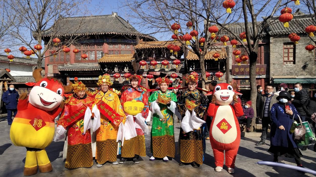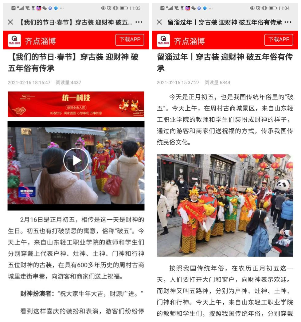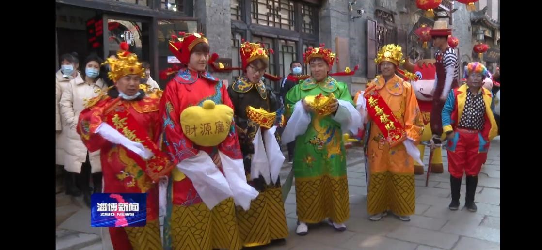 大年初五,周村古商城素有“财神到我家”传统民俗活动,团总支书记蔡嘉慧组织商务贸易系辅导员和学生团员一大早来到景区,有的装扮成五路财神,有的装扮成萌萌的“吉祥小牛”,在牛年“破五”这一天,在周村古商城与游客互动,给游客和商户带来欢乐与祝福。