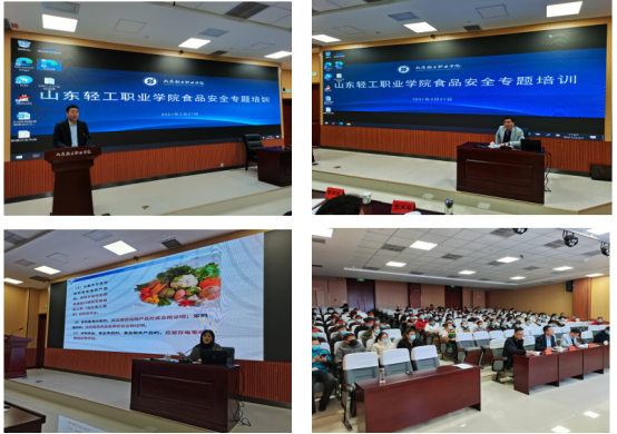 2月27日上午,后勤处邀请周村区市场监管局陈晓宇副局长、稽查大队侯文娟大队长到我校进行食堂从业人员食品安全专题培训。培训由后勤处处长管清武主持,后勤处副处长王革、膳食科及各食堂从业人员近130人聆听了培训讲座。