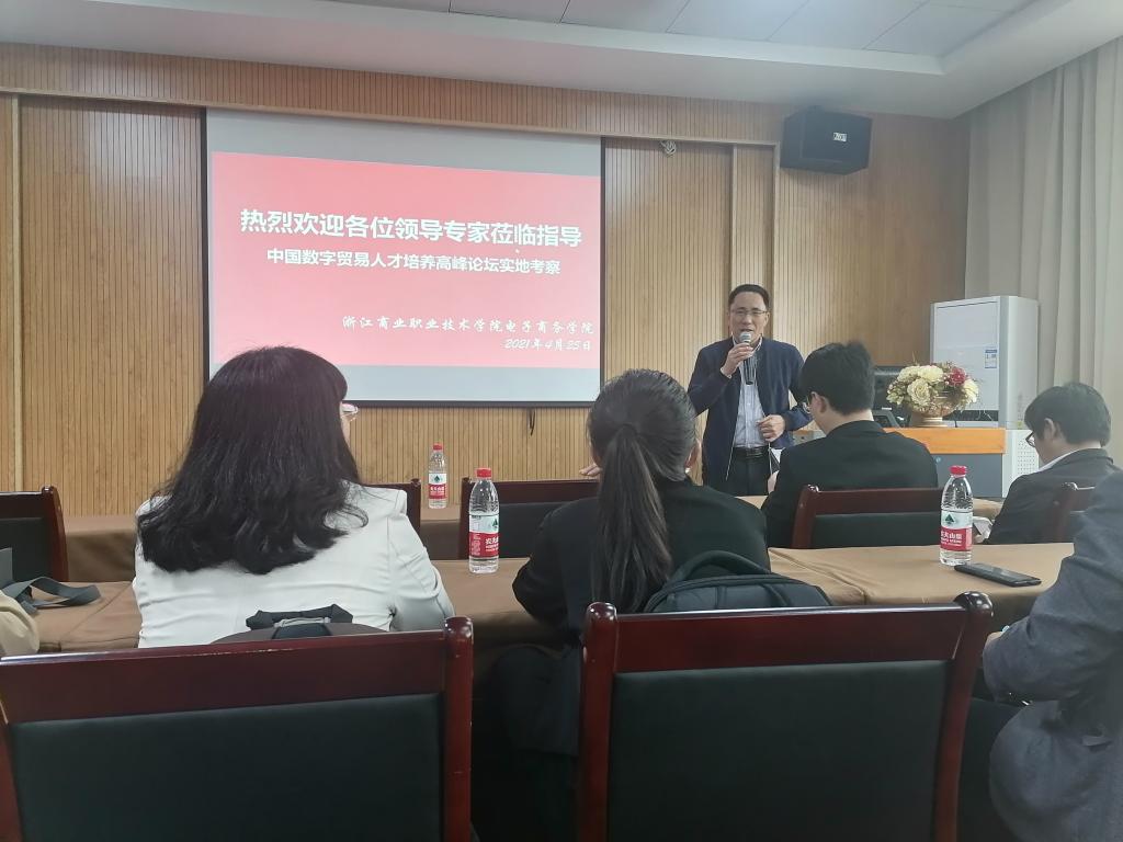 论坛结束后,赴浙江商业职业技术学院电子商务学院参观交流。首先电子商务学院院长张枝军从电子商务专业群组群逻辑;专业体系结构;多元合作、多方联动、混合协同人才培养模式;课堂教学组织形式等方面精讲了依托项目工作室开展产教融合的实际案例。随后,参观了商业职业技术学院的实境实战运营室以及工作室。