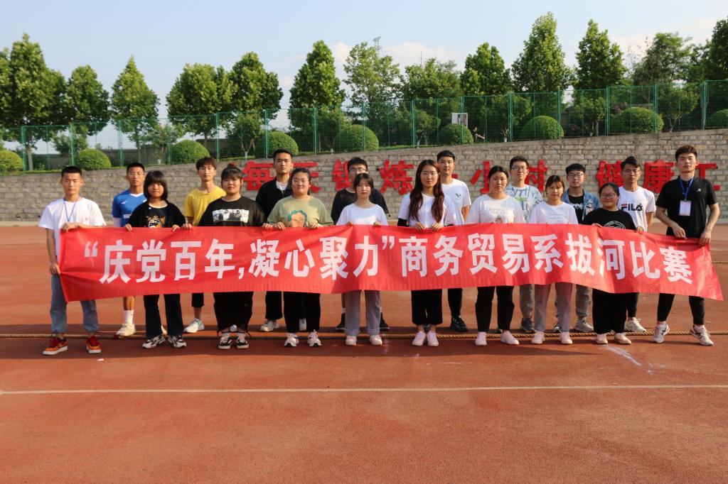 为庆祝中国共产党成立100周年,丰富大学生的业余生活,进一步提升班级团队合作和凝聚力,促进各班间的交流,商务贸易系开展了“庆党百年·凝心聚力”拔河比赛活动。