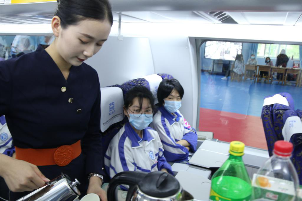 5月23日,山东轻工职业学院举办的职业教育活动周“航空模拟舱体验”与“茶艺展演与体验”活动在空中乘务专业模拟舱实训中心展开。