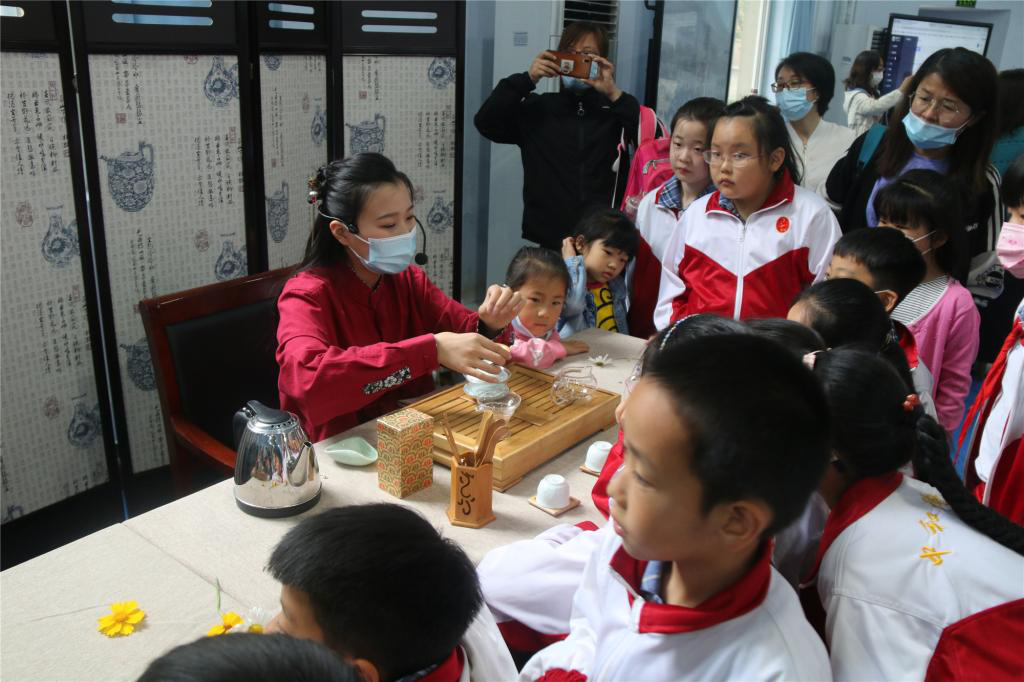 各中小学研学团陆续参观实训中心,积极进行职教体验。“航空模拟舱体验”活动内容主要包括舱内广播、安全带与救生衣的使用、调整座椅靠背、收放小桌板、呼叫按钮、饮料服务。在“茶艺展演与体验”活动中,先由茶艺老师和助手进行茶艺表演,然后请体验者进行现场学习体验盖碗的使用方法和整套泡茶流程。研学团学生们对各项活动体验非常积极,现场气氛热烈,很多小朋友们希望明年还有机会参观学习。
