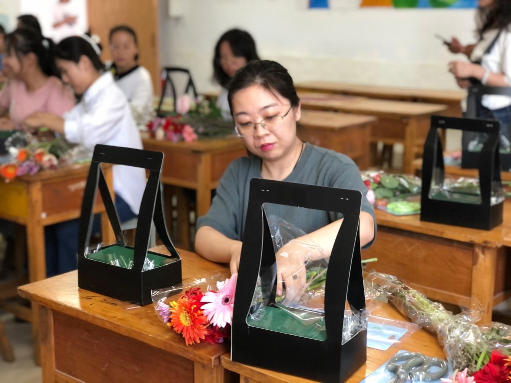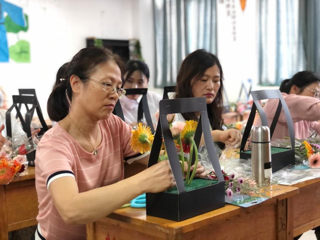 活动开始,花艺师对插花的由来、花器的异同进行了讲解,介绍了花材、叶材的修剪处理,插花的基本结构和基本造型枝法,并为大家示范插花步骤,在花艺师的讲解和指导下,教职工们展现自己的聪明才智,充分发挥对美的想象和创意,经过一个多小时的亲手实践,一篮篮各具特色的美丽插花作品展现在大家眼前,大家手捧着自己的得意之作,纷纷拍照留影,脸上洋溢着喜悦之情。