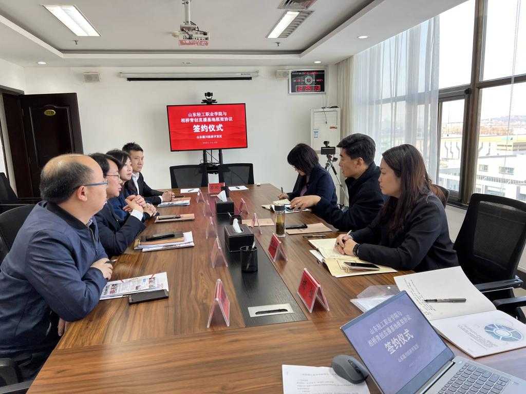 随后,在淄川经济开发区与相桥青创直播基地举行框架协议签约仪式,淄川经济开发区党工委副书记、钟楼街道党工委书记张宁出席。校企双方均表示进一步发挥青创电商直播基地的作用,深化校企在孵化基地品牌、打造孵化产业、助力乡村振兴等方面的合作,进一步探讨高校服务地方社会经济发展新模式,开辟乡村振兴新途径。