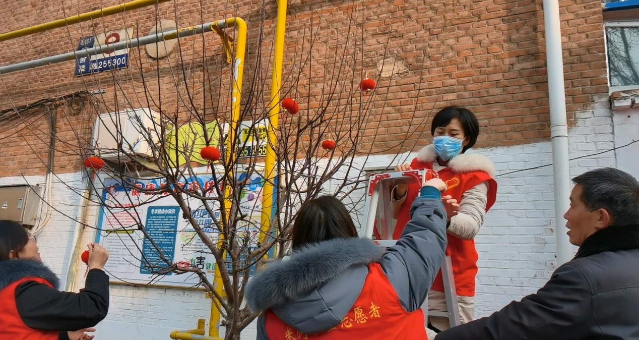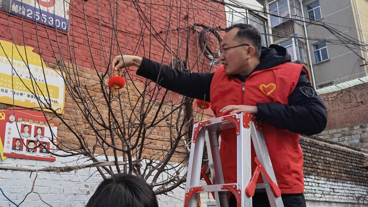 走访结束后,大家分成小组,带着喜庆的灯笼和工具,开始布置街道。志愿者们扛着梯子,有的负责提灯笼,有的查看悬挂的位置,他们分工合作,一个递灯笼,一个挂灯笼。在大家的密切配合下,一个个带着祝福的红灯笼高高挂在了枝头,街道顿时洋溢着浓浓的节日氛围,过往的群众高兴地说:“这灯笼挂上去,看着可真喜庆!”“灯笼一挂就有年味儿了!”志愿者们忙得开心,居民们看得高兴,整个社区充满了浓浓的年味儿和人情味儿。