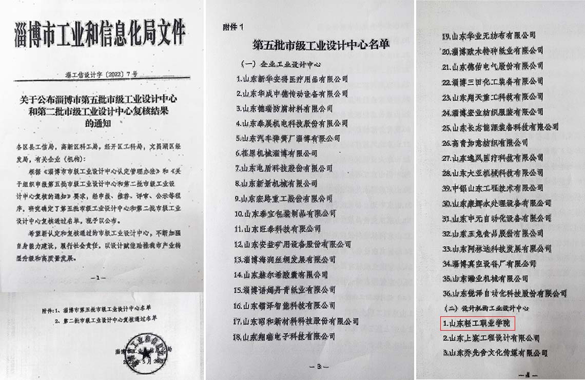 近日,淄博市工业和信息化局发布《关于公布淄博市第五批市级工业设计中心和第二批市级工业设计中心复核结果的通知》,艺术设计系和机电工程系联合申报的工业设计中心,被认定为第五批市级工业设计中心。