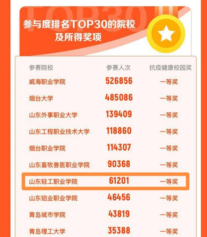 近日,由中国大学生体育协会主办,山东省学校体育协会承办的中国大学生健康校园大赛暨AI体能赛(山东赛区)比赛历时7周落下帷幕,学校获“抗疫健康校园奖”一等奖!充分展示了轻工学子健康向上、勇于拼搏的良好精神风貌。