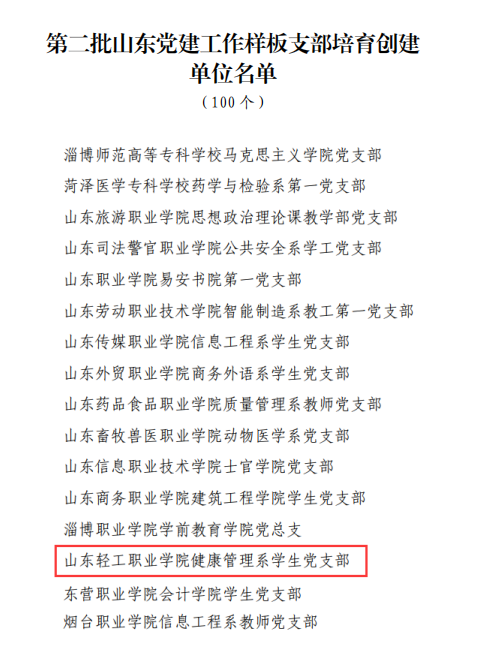 近日,中共山东省委教育工委公布第二批全省新时代高校党建示范创建和质量创优工作遴选结果,我校健康管理系学生党支部入选“山东党建工作样板支部”培育创建单位。