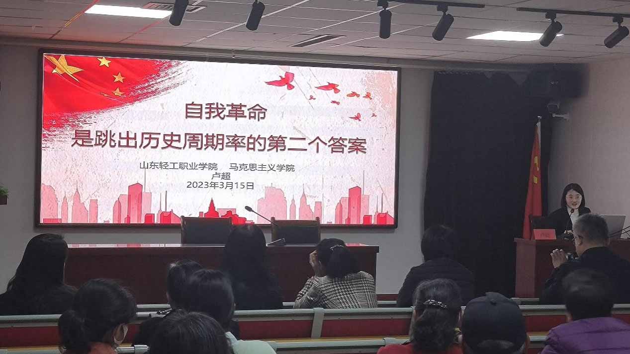 我校马克思主义学院思政课教师卢超作《自我革命,是跳出历史周期律的第二个答案》的宣讲。卢超以党史事件为切入点,生动地介绍了人民民主、人民监督与自我革命这两个答案的来历、关系和党进行自我革命的伟大实践,提出“作为直接服务群众的基层党组织、要筑牢党群关系,党风廉政建设更要常抓不懈。要时刻把群众的安危冷暖放在心上,心怀敬畏去关爱和服务群众,让群众的满意度成为基层党组织工作的‘试金石’”。