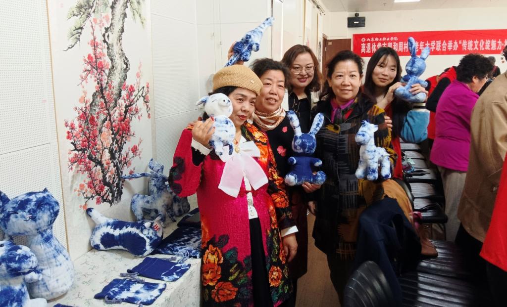 活动现场共有六个展示项目,每个活动区域都有专门的师生志愿者提供相关服务。李群英书记为大家展示和讲解了系部师生共同创作的文创作品;王锋荣教授为大家讲解鲁绣和现场演示手工香包制作;离退休党支部孙沅志老师和杨娜老师带领大家亲身体验扎染制作;李磊老师带领大家现场制作文创DIY皮具挂件;纪委机关党支部陈永滨老师为大家进行廉洁文化和脸谱绘制知识的讲解,并现场带领大家一起进行脸谱绘制体验。不同的展示项目,将非遗文化的独特魅力体现得淋漓尽致。活动的开展不仅带领区老年大学的学员们切身体验了中华优秀传统文化,也进一步弘扬了中华民族“尊老、敬老、爱老、助老”的传统美德。