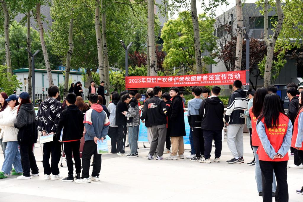 4月24日,在大学生文化广场举办了校园知识产权普法展览,淄博市知识产权事业发展中心的预审员和周村区市场监督管理局的工作人员在现场为师生宣传、答疑,400余名师生参与了答题抽奖环节。