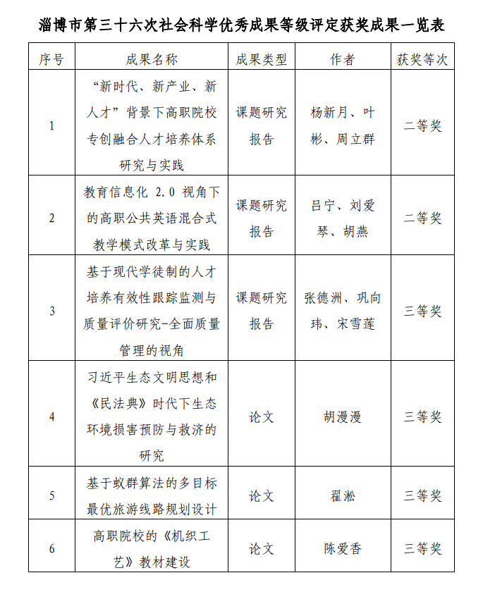 本站讯(通讯员 虞湛)近日,淄博市社会科学优秀成果等级评定委员会发布了《关于公布淄博市第三十六次社会科学优秀成果等级评定结果的通知》,我校在本次优秀成果等级评定中取得了二等奖2项、三等奖4项的优异成绩。