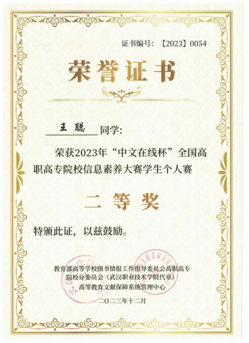 由图书馆马栋之、张珊珊两位老师指导,纺织工程系的王紫晗同学和嘉环ICT产业学院的王聪同学经过校赛、省赛层层选拔,分别以省赛一等奖和二等奖的优异成绩成功入围全国决赛,来自27个省623所院校的1066位参赛选手展开激烈角逐,最终王聪同学脱颖而出获得国赛二等奖。