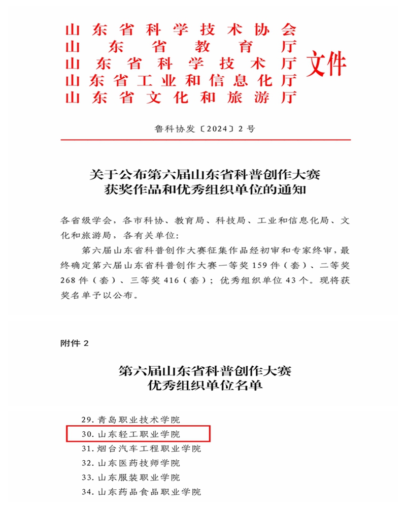 本站讯(通讯员 虞湛)近日,由山东省科学技术协会、山东省教育厅、山东省科学技术厅、山东省工业和信息化厅、山东省文化和旅游厅联合组织的第六届山东省科普创作大赛落下帷幕,经大赛评委会评选,共评出获奖作品843件(套)和优秀组织单位43个。我校报送参赛作品78项,共34项作品获奖,获奖率为43.6%,其中一等奖9个、二等奖10个、三等奖15个,学校蝉联“山东省科普创作大赛优秀组织单位”称号。较往年我校在该项比赛中取得的成绩,今年实现了一等奖数量和获奖率的新突破,作品质量显著提升。