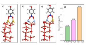 合理组装不同贵金属纳米晶体,并在实体中控制纳米间隙,可以有效地耦合每个组分的电磁场并可以对整体物理化学性质进行多方位调控。在本研究中,合成了混合组装金纳米片和银纳米颗粒。本研究依赖于将Cu2O均匀包覆在金纳米片上作为中间层,通过Cu2O与Ag+之间的电偶置换反应原位形成银纳米颗粒。通过将银纳米颗粒锚定在包覆有Cu2O的金纳米片上,形成的混合纳米结构,其在UV-vis-NIR区域展现出显著的多重等离激元吸收。王莹莹老师通过密度泛函方法(DFT)验证了其在4-硝基苯酚还原反应中的潜在应用。计算结果显示,混合的AuAg纳米片吸附反应物能力和催化性能显著提高。除此之外,混合组装金纳米片和银纳米颗粒还在Xe灯照射下表现出优越的光热转化性能。当前工作提供了一种独特的方法,可用于创建具有可控粒间距和可调光等离激元性质的贵金属混合纳米结构,此方法可扩展至其他贵金属或合金。