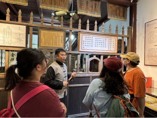 在周村古商城大德通票号,山东轻工职业学院研学旅行管理与服务专业的学生用情景演绎为古商城发展注入“轻”春活力。“谨防假票冒取,勿忘细视书章。这十二个字代表每年的十二个月……各位游客听懂了吗?”饰演账房先生的同学与游客进行互动,为游客讲解票号的防解密押表,得到游客的一致好评。队员们积极配合古商城工作人员进行宣传工作,双方通力合作,为周村古商城打造为5A级景区注入“轻”春活力,贡献青年力量。