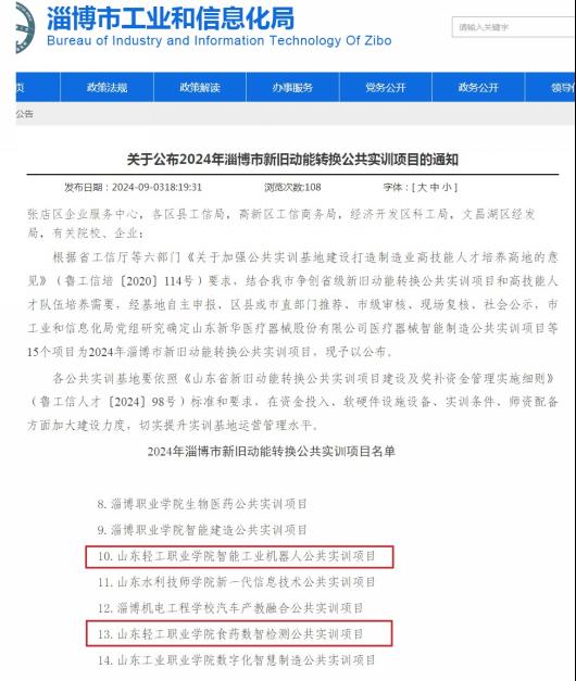 本站讯(通讯员 王金柱)近日,淄博市工业和信息化局公布了《2024年淄博市新旧动能转换公共实训项目名单》,我校智能工业机器人、食药数智检测两个公共实训项目成功入选。