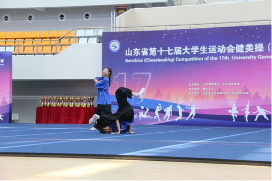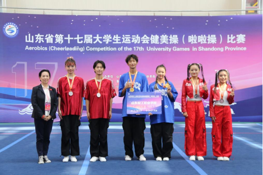 本站讯(通讯员 贾希宇 王亚楠 王芹)10月1日至5日,由山东省教育厅和山东省体育局主办的山东省第十七届大学生运动会健美操(啦啦操)比赛成功举办。本次比赛吸引了来自全省72所高校的代表队参加。经过激烈角逐,我校信息工程系牛晓锋和健康管理系李晓勇夺双人街舞啦啦操项目的金牌。