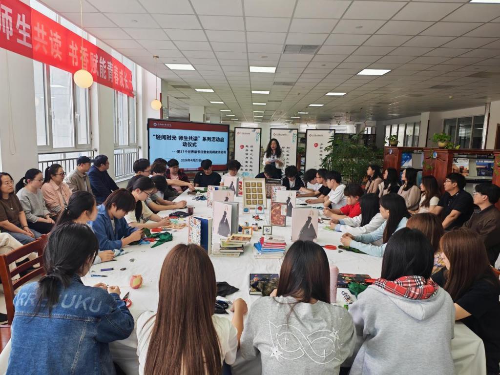 坚持全域覆盖、全员参与、全程推进,推动非遗阅读常态化、长效化,让书香满溢校园。学校多措并举、多点发力,打造多层次、立体化阅读服务体系。在资源供给上,自4月23日起,图书馆借阅区特设非遗主题专题书架,集中陈列非遗文化、传统技艺、艺术创作等优质图书,同步开展“文润荐新”线下荐购活动,精准对接师生阅读需求,优化馆藏资源结构。在交流分享上,举办“非遗与阅读”师生共读沙龙,通过“馆长与你共读一本书”活动,围绕非遗题材图书开展研讨交流,分享阅读感悟与创作心得,促进阅读成果转化,营造共学、共读、共研、共享的良好氛围。在成果展示上,活动期间于图书馆一楼开设非遗手作成果展,同步上线线上云展览,依托校园公众号、视频号等新媒体平台广泛推送,实现线上线下联动展示,全方位呈现活动成果,扩大文化传播影响力。