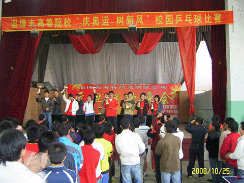 经过两周的精心筹备,布置比赛场地,完善比赛设备,乘借深入学习实践科学发展观的东风,于2008年10月24—25日,山东丝绸纺织职业学院文体馆承办了由淄博市高教工委主办的淄博市高等院校“庆奥运,树新风”校园乒乓球比赛,淄博市高教工委黄志兴副书记、淄博市高等教育工作办公室刘万岭副主任,学院党委书记高素贞同志、王济雨同志、李学静同志出席了开幕式。