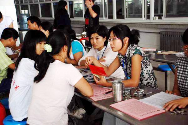 班主任在为甘肃灾区学生讲解学院针对针对灾区学生的资助方法