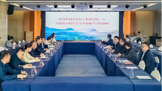 下午,调研组实地考察了淄博电子工程学校和山东财经大学乡村振兴学院。在淄博电子工程学校,调研组现场察看了实训中心设施设备及实训教学情况,并就开展校校合作、人才培养等内容深入交流。在山东财经大学乡村振兴学院,调研组现场调研了学院建设运营情况,详细了解了学院在赋能乡村振兴、人才培养等方面的取得的成效。随后,在山东财经大学乡村振兴学院进行座谈交流。