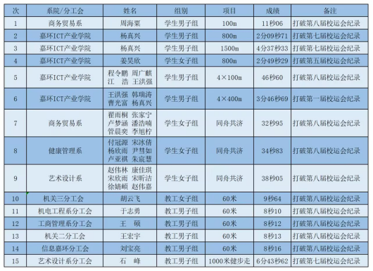 经过两天紧张激烈的角逐,各项比赛圆满结束。运动员们在赛场上赛出了风格,赛出了水平,共有15人次打破学校田径运动会10个项目的纪录。嘉环ICT产业学院、商务贸易系、健康管理系分获学生组团体总分前三名,机电工程系分工会、机关三分工会、工商管理系分工会分获教职工组团体前三名,商务贸易系、健康管理系荣获体育道德风尚奖。在闭幕式上,学校领导为获奖的个人和团体颁发了锦旗和证书,对所有运动员的拼搏精神给予了高度赞扬,也向为运动会辛勤付出的工作人员表示衷心感谢。